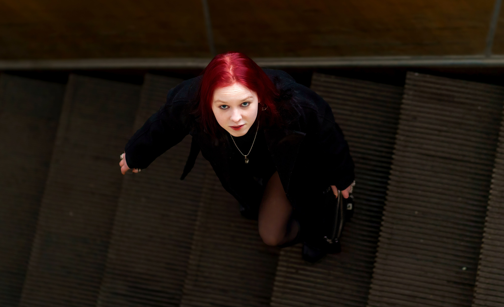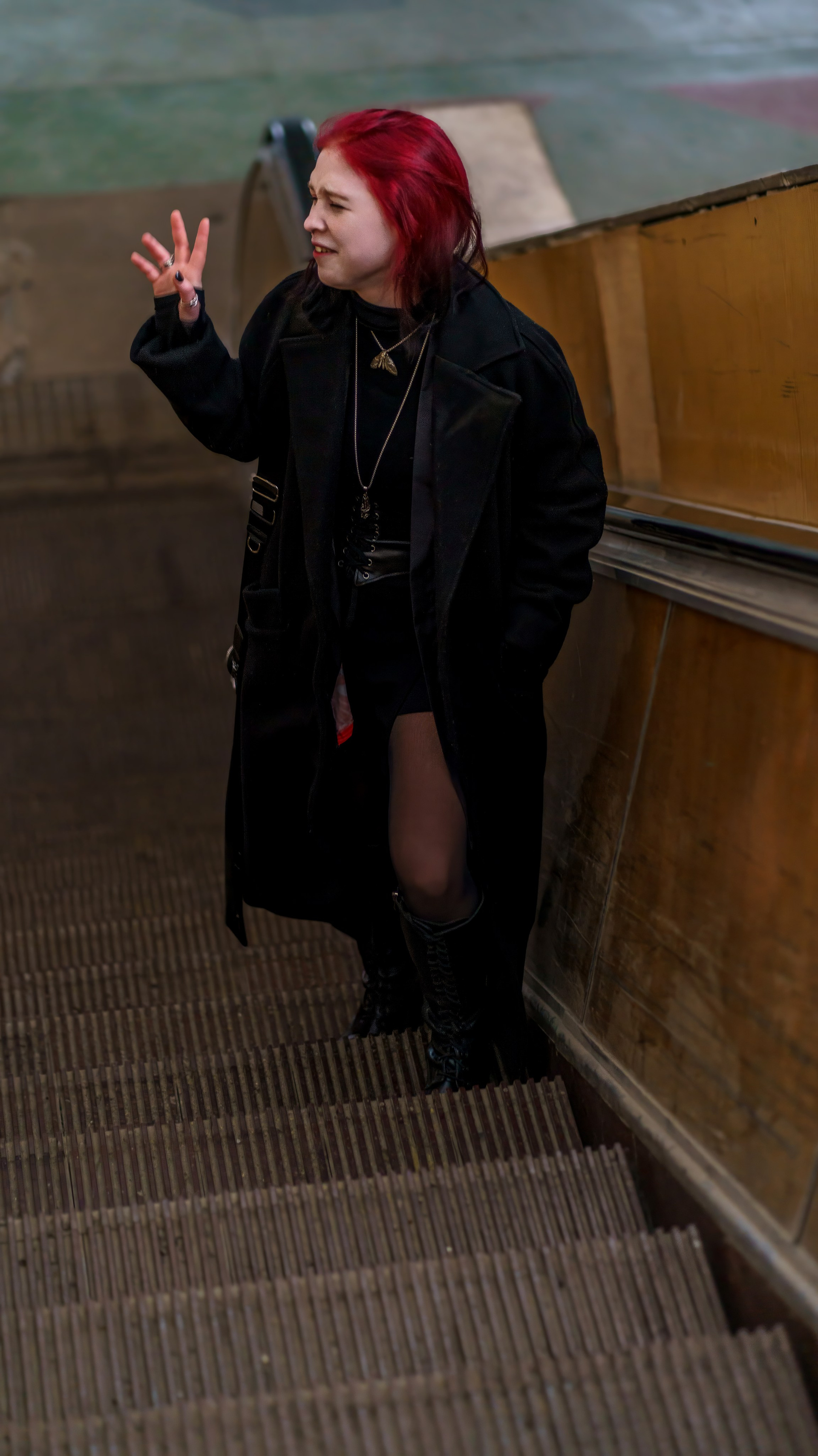 Девушка с красными волосами стоит на ступеньках эскалатора и смотрит в объектив фотографа