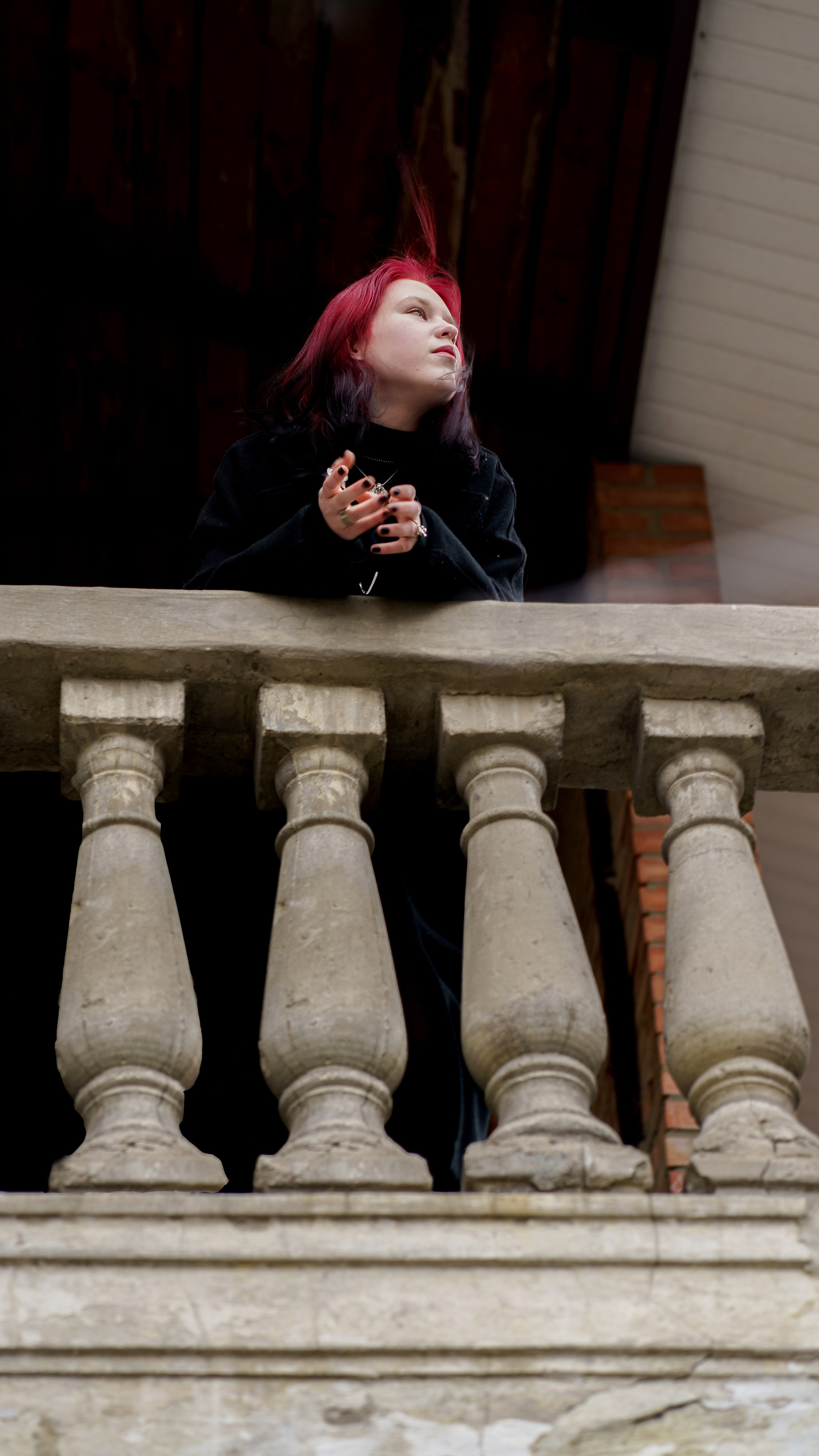 Девушка в черном пальто, с красными волосами - смотрит вдаль, опираясь на перила