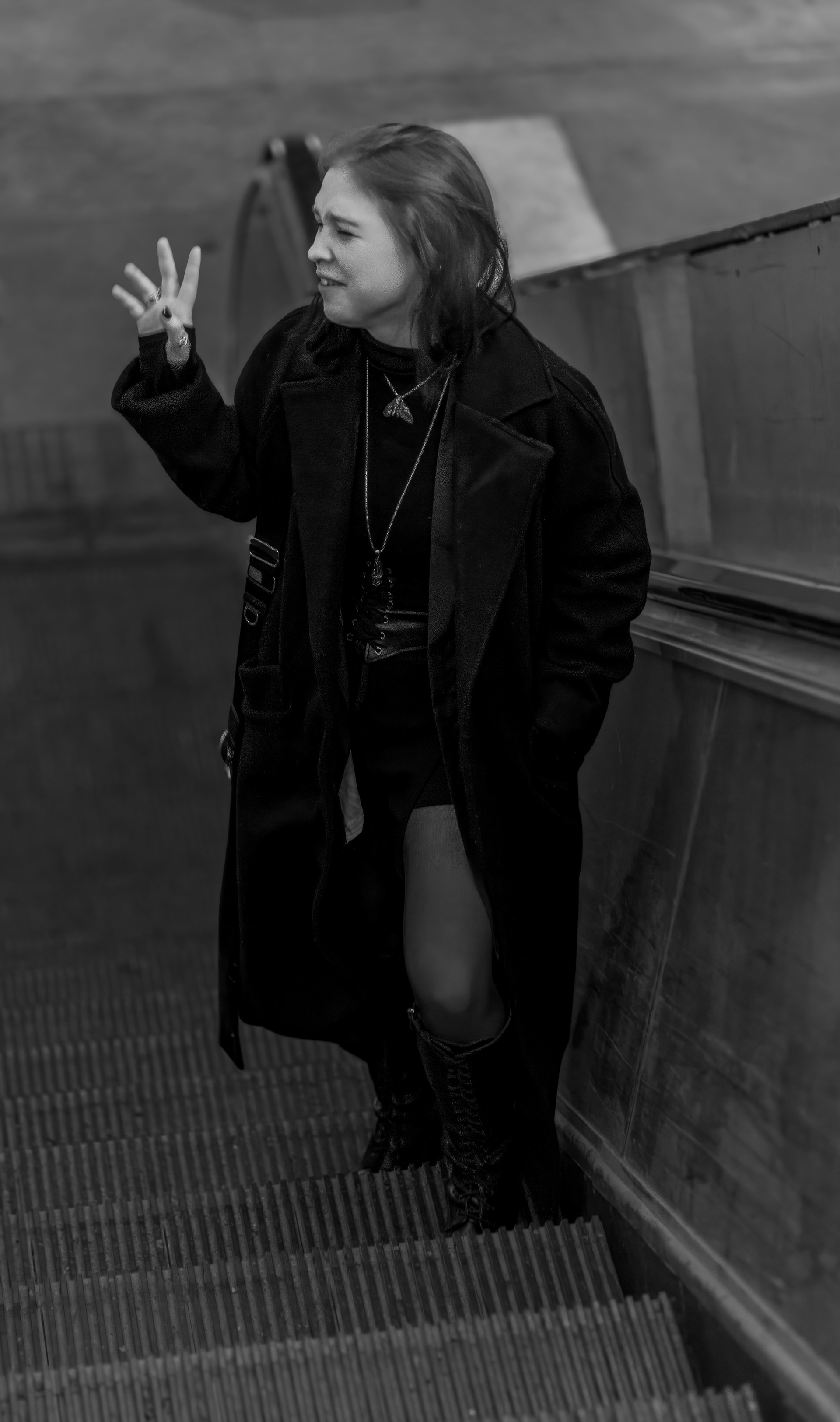 Черно-белый портрет девушки,  стоящей на ступеньках эскалатора и машушей кому-то рукой
