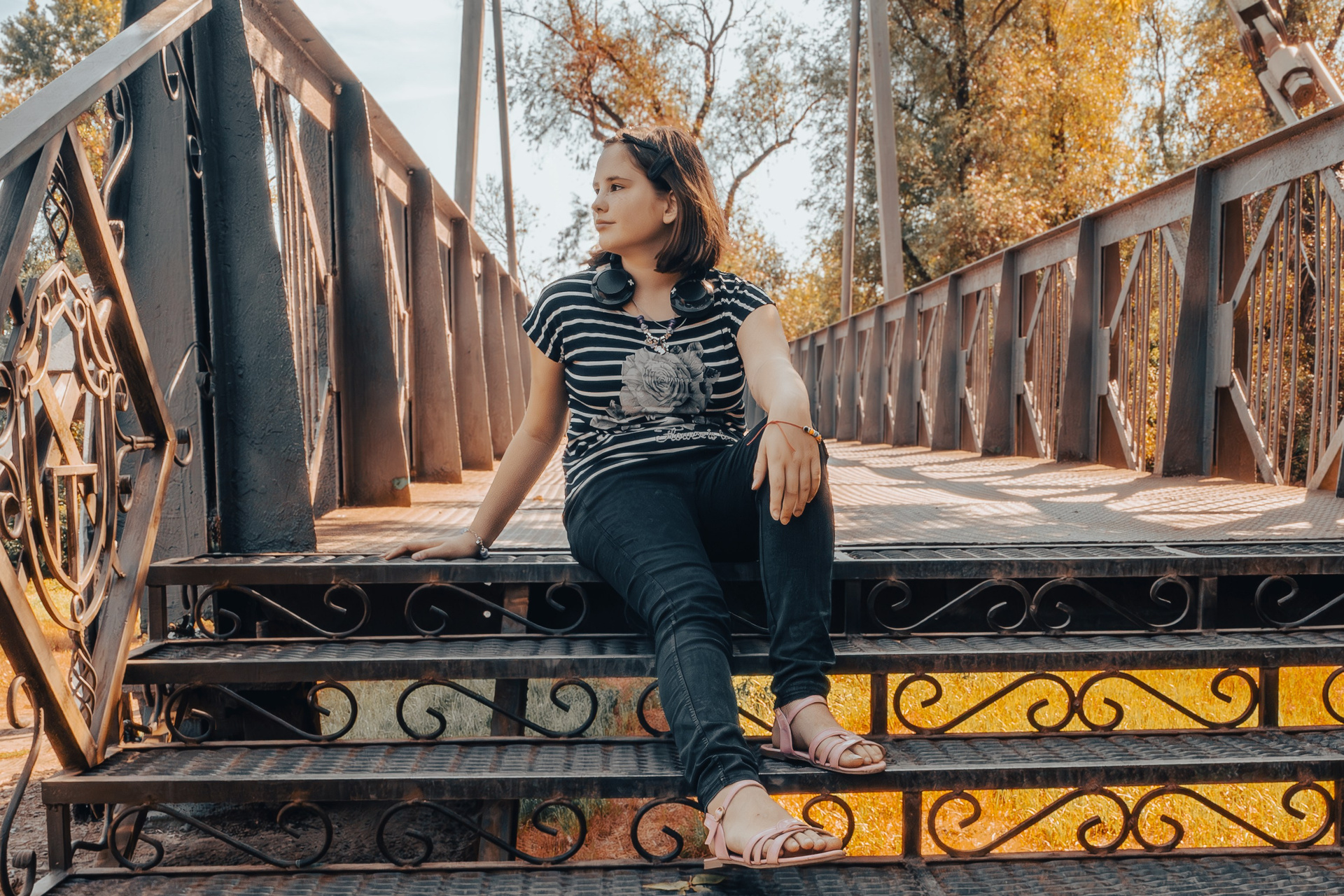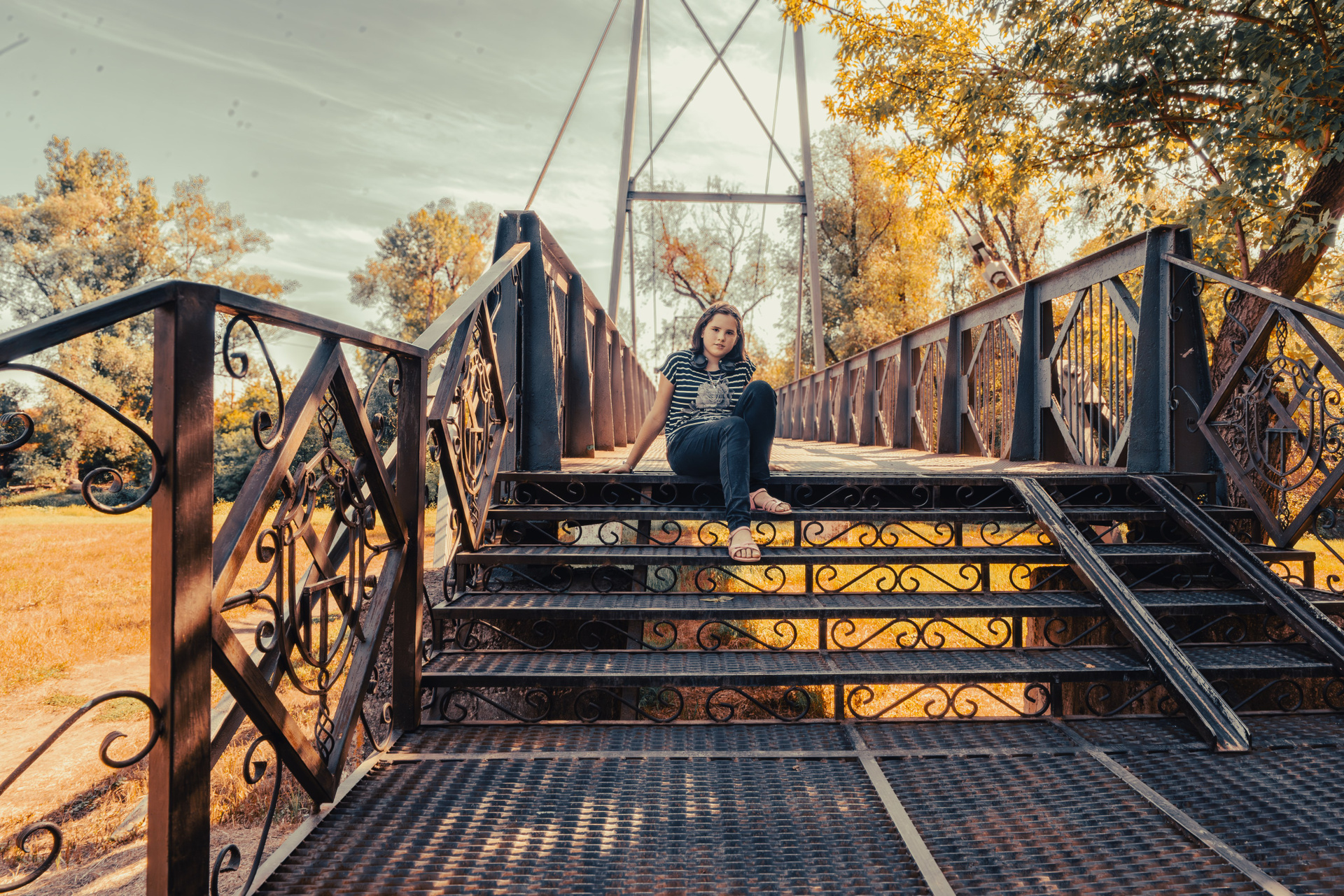 Девочка сидит на металлической ступеньке моста , девочка сидя на ступеньке вполоборота смотрит вдаль