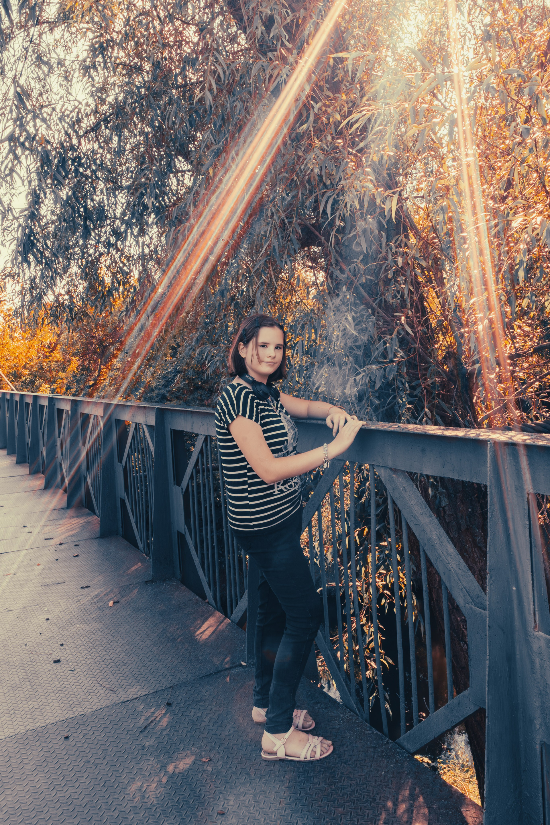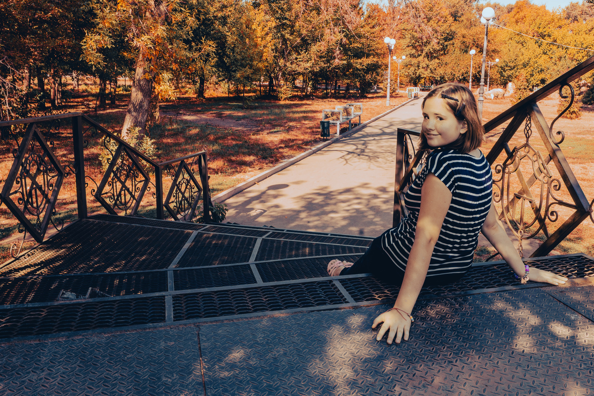 Девочка сидит вполоборота на мосту и смотрит в объектив через плечо