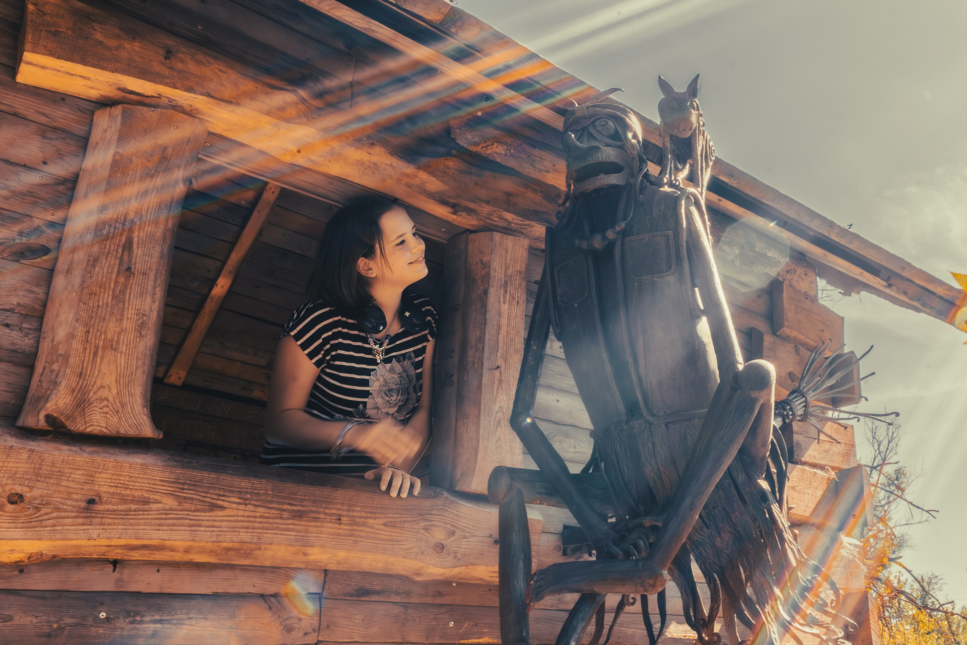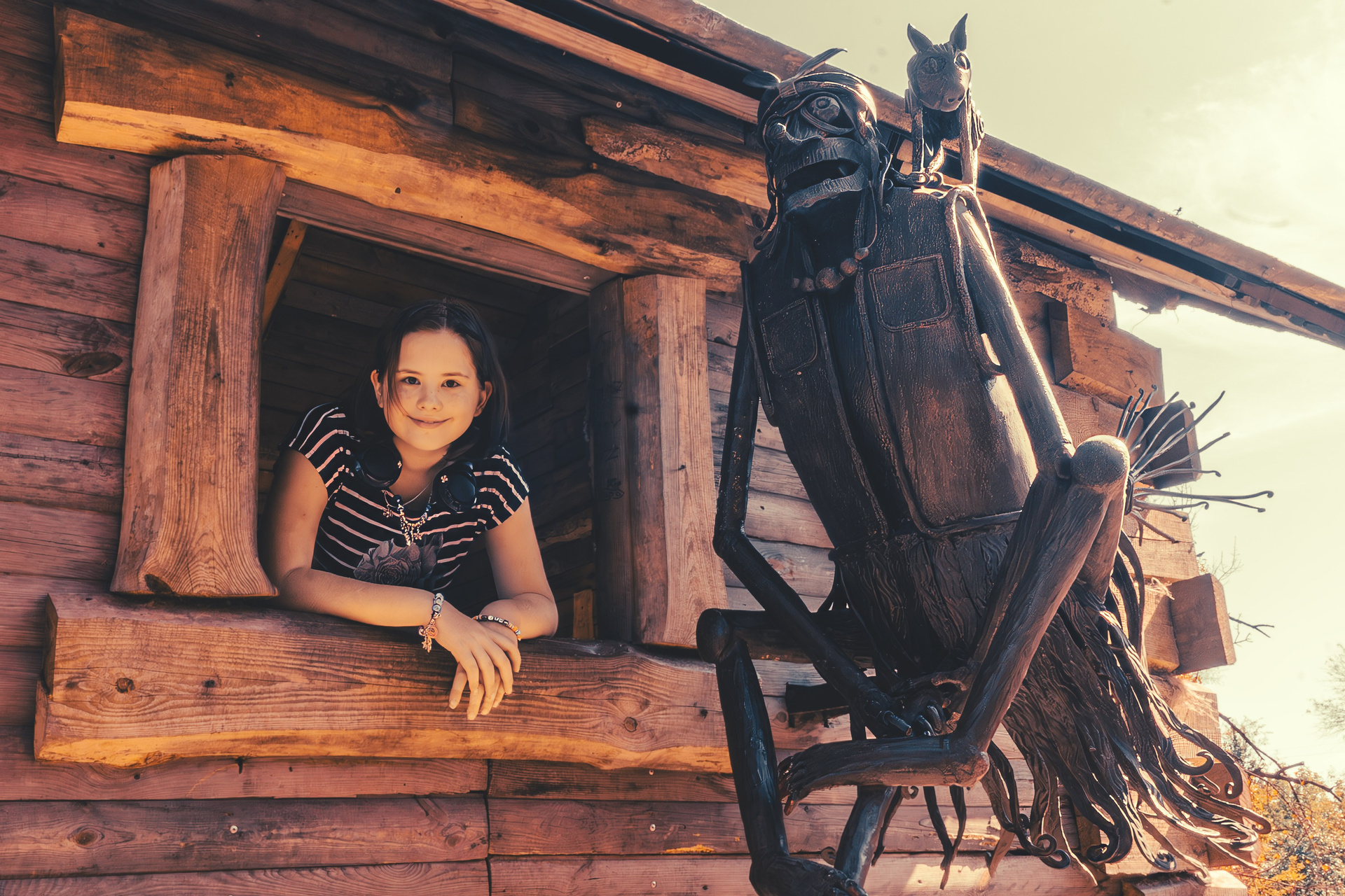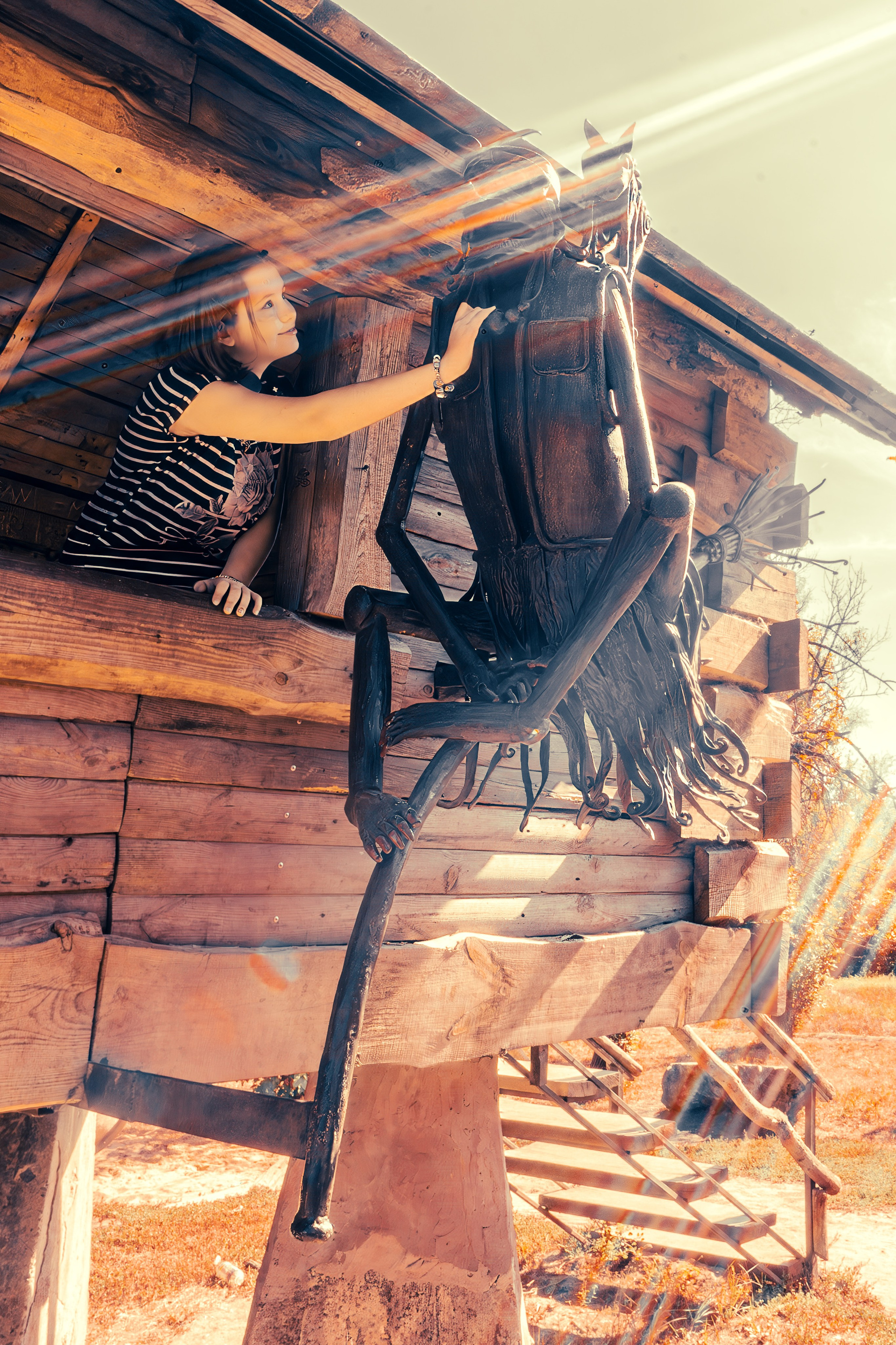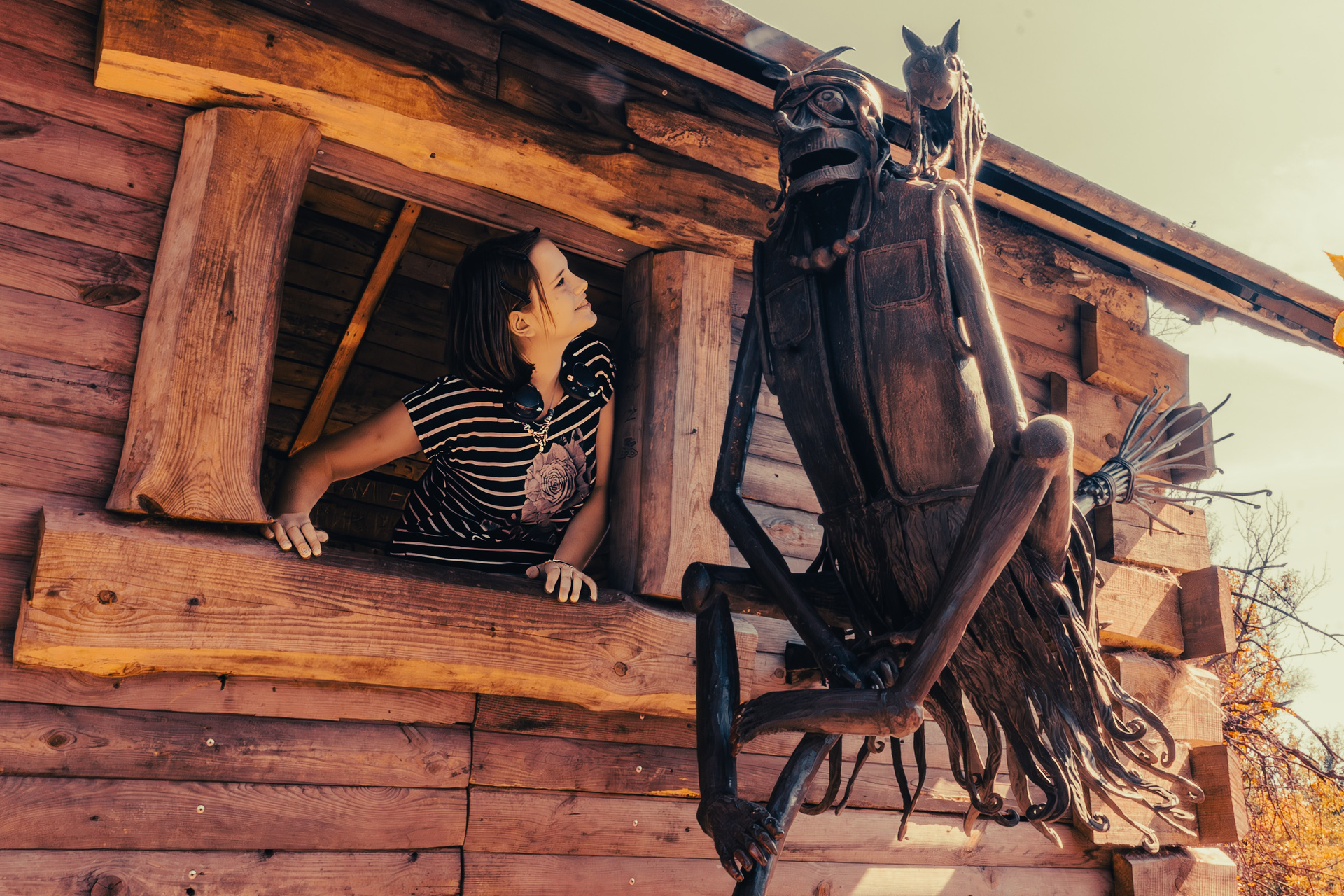 Девочка смотрит из окошка избушки на инсталляцию Бабы Яги